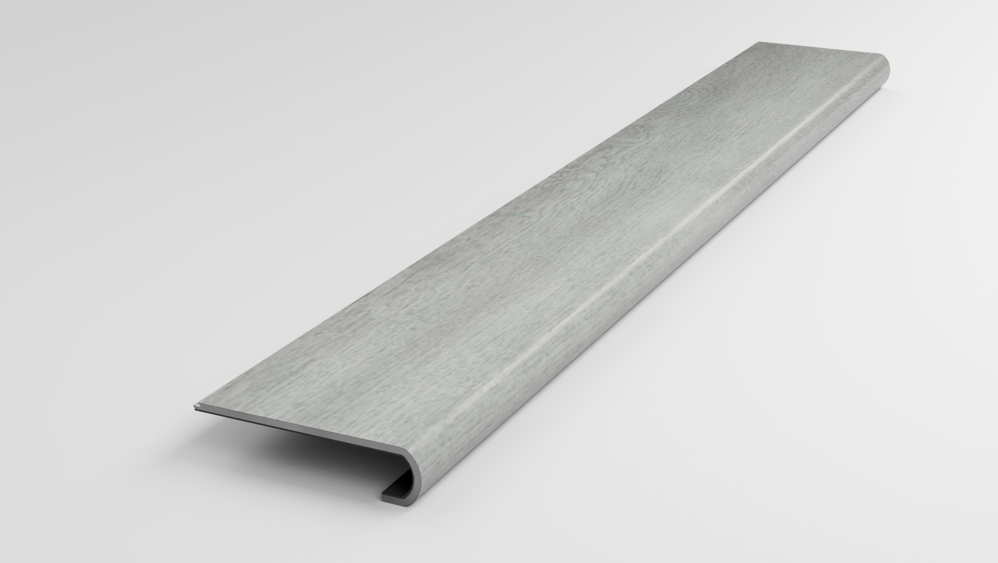 This variant is a Stair Nose made from a Home Decorators Collection Athabasca Glacier Gray Luxury Vinyl Plank. It is designed to be fitted and glued to the unfinished Stair Tread Nose. An addition Home Decorators Collection Athabasca Glacier Gray plank that you supply can be clicked in behind the nose to cover the remaining unfinished area.