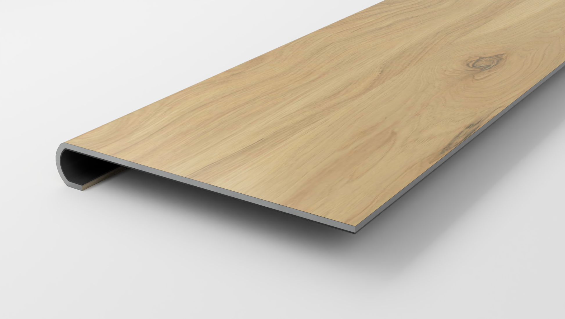 Made from NuCore Aurora Heights flooring, this Stair Nose will now allow you to use your favorite flooring on your stairs. Previously, you would have to use other tread brands that were made of subpar materials and only looked similar to your flooring! To make matters worse, a transition piece was often required at the top of the stairs posing both a hazard, and an eye sore. Treads Plus has made it possible to use true NuCore* Aurora Heights flooring to seamlessly transition from your flooring to your stairs.