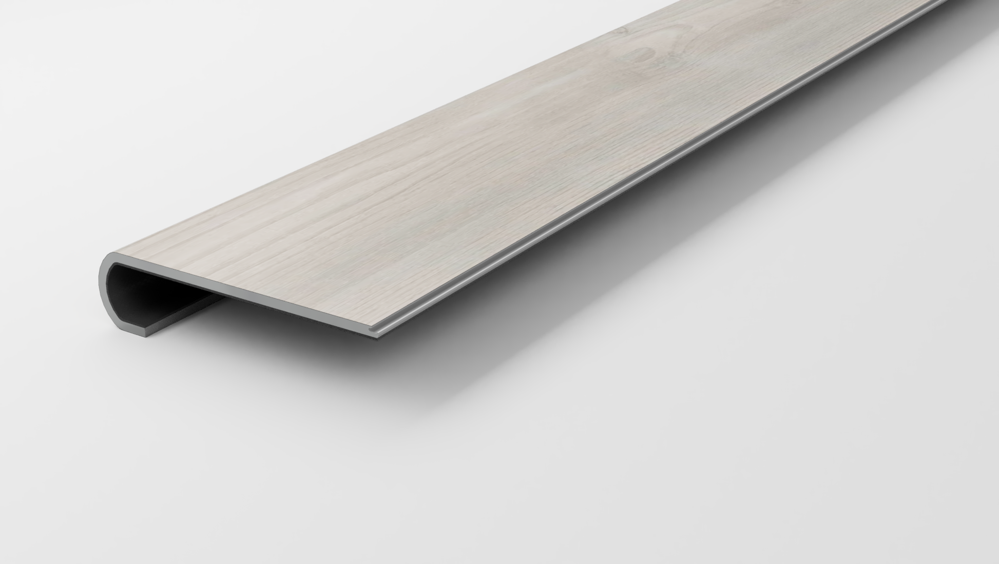 Made from Shaw Floorte Pro | Anvil Plus 20mil | Clean Pine flooring, this Stair Nose will now allow you to use your favorite flooring on your stairs. Previously, you would have to use other tread brands that were made of subpar materials and only looked similar to your flooring! To make matters worse, a transition piece was often required at the top of the stairs posing both a hazard, and an eye sore. Treads Plus has made it possible to use true Shaw* Floorte Pro | Anvil Plus 20mil | Clean Pine flooring to seamlessly transition from your flooring to your stairs.