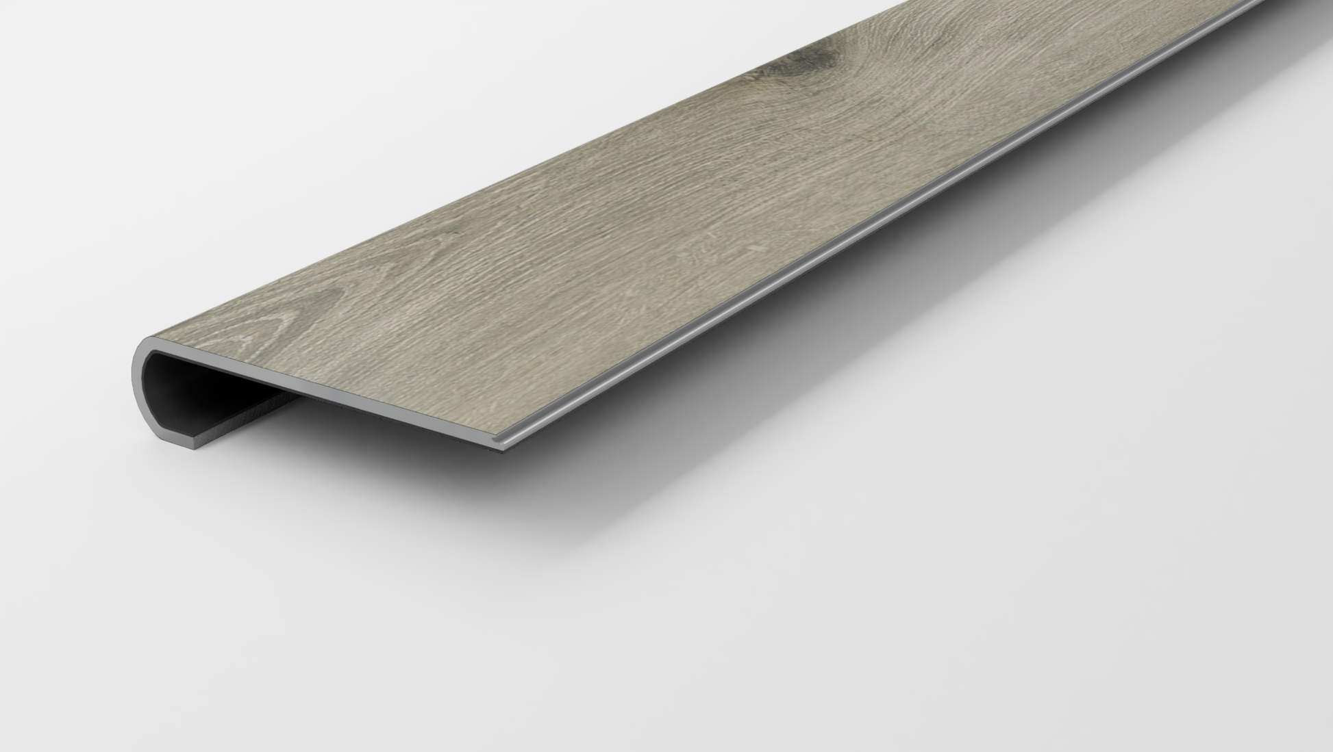 Made from Duralux Performance Gibson Road flooring, this Stair Nose will now allow you to use your favorite flooring on your stairs. Previously, you would have to use other tread brands that were made of subpar materials and only looked similar to your flooring! To make matters worse, a transition piece was often required at the top of the stairs posing both a hazard, and an eye sore. Treads Plus has made it possible to use true Duralux Performance* Gibson Road flooring to seamlessly transition from your flooring to your stairs.