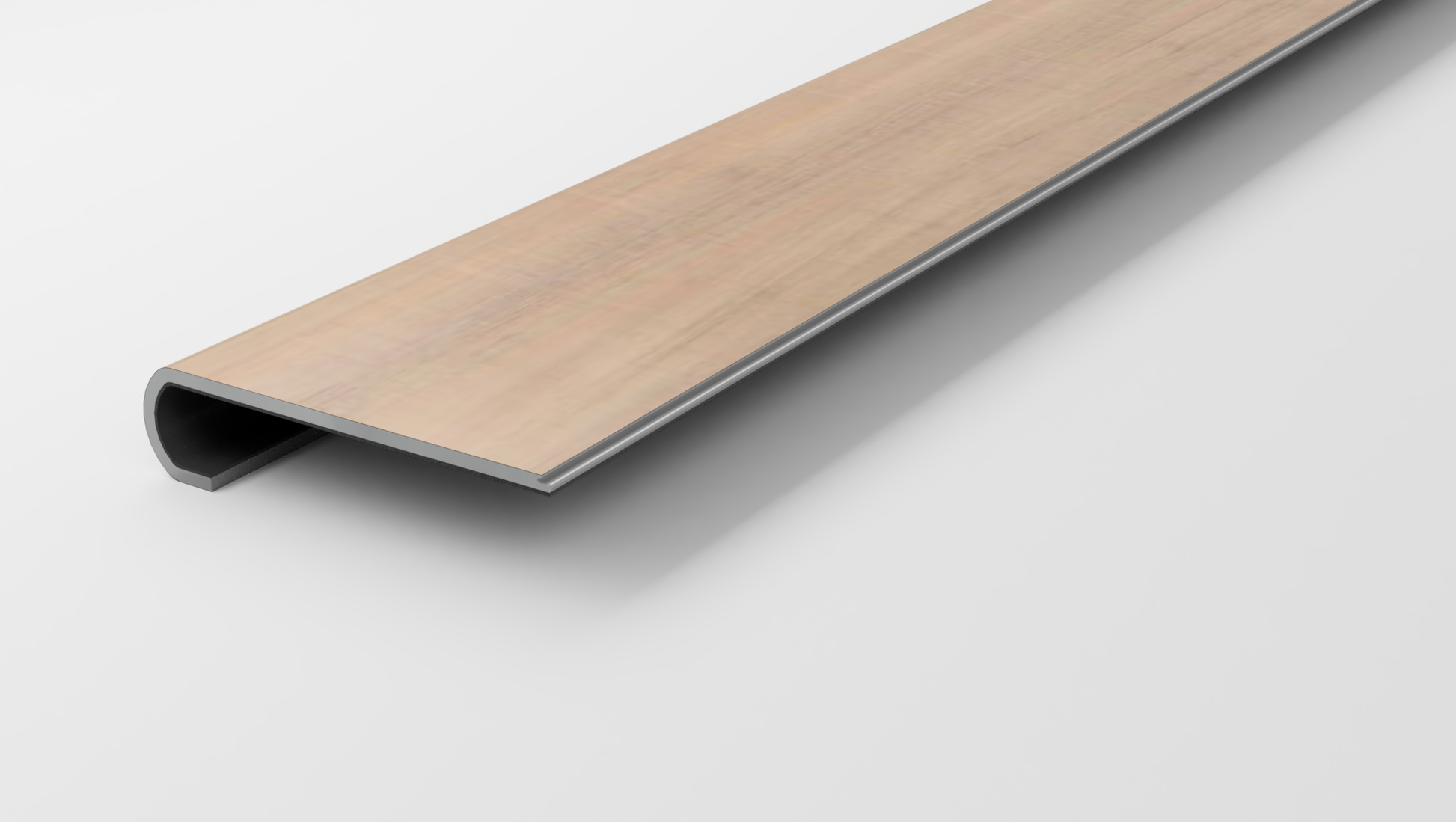 Made from Shaw Highland Stucco 20 MIL flooring, this Stair Nose will now allow you to use your favorite flooring on your stairs. Previously, you would have to use other tread brands that were made of subpar materials and only looked similar to your flooring! To make matters worse, a transition piece was often required at the top of the stairs posing both a hazard, and an eye sore. Treads Plus has made it possible to use true Shaw* Highland Stucco 20 MIL flooring to seamlessly transition from your flooring to your stairs.