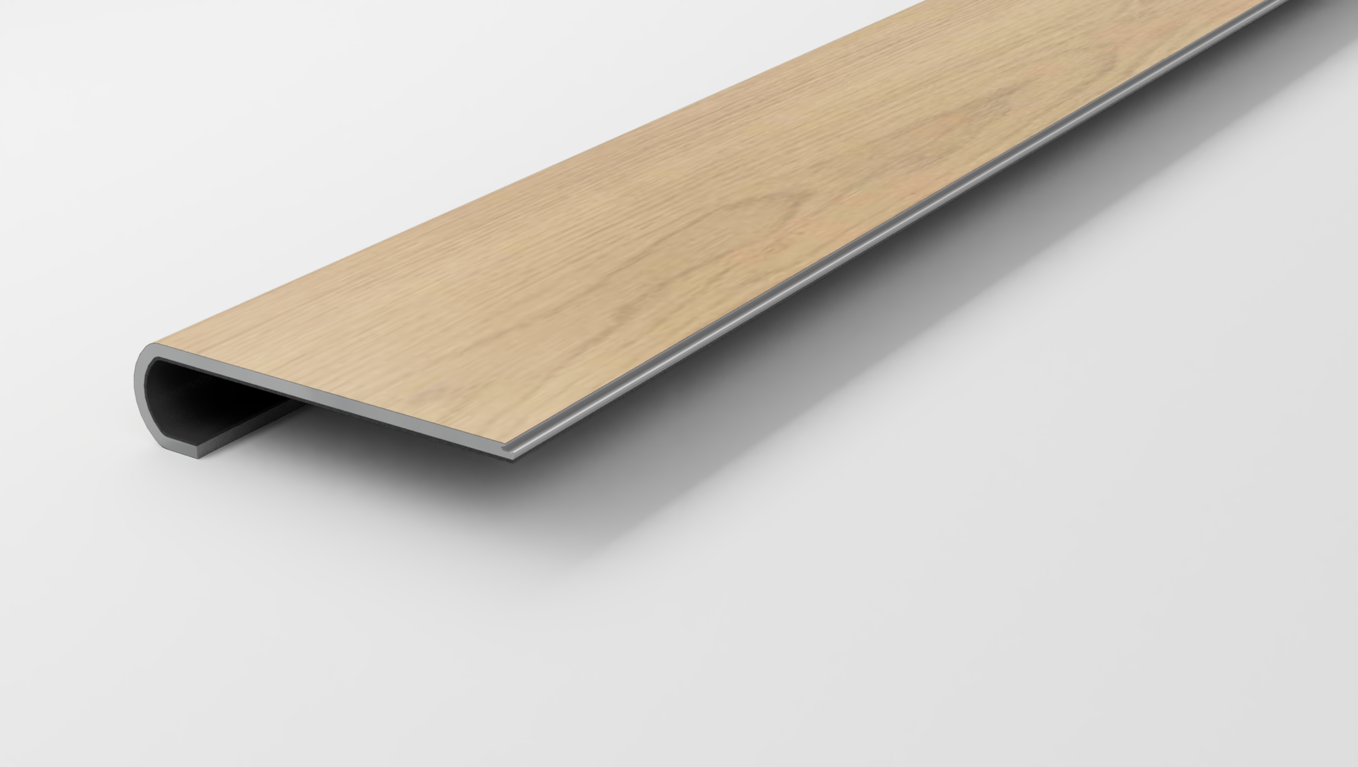 Made from Shaw Highland Umber 20 MIL flooring, this Stair Nose will now allow you to use your favorite flooring on your stairs. Previously, you would have to use other tread brands that were made of subpar materials and only looked similar to your flooring! To make matters worse, a transition piece was often required at the top of the stairs posing both a hazard, and an eye sore. Treads Plus has made it possible to use true Shaw* Highland Umber 20 MIL flooring to seamlessly transition from your flooring to your stairs.