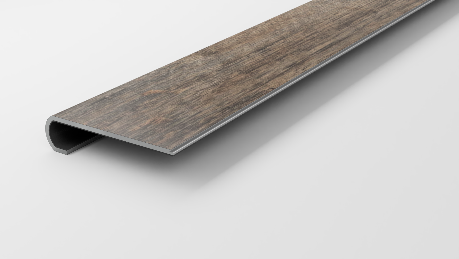 This variant is a Stair Nose made from a Shaw Korlok Select | Salvaged Barnwood Luxury Vinyl Plank. It is designed to be fitted and glued to the unfinished Stair Tread Nose. An addition Shaw Korlok Select | Salvaged Barnwood plank that you supply can be clicked in behind the nose to cover the remaining unfinished area.