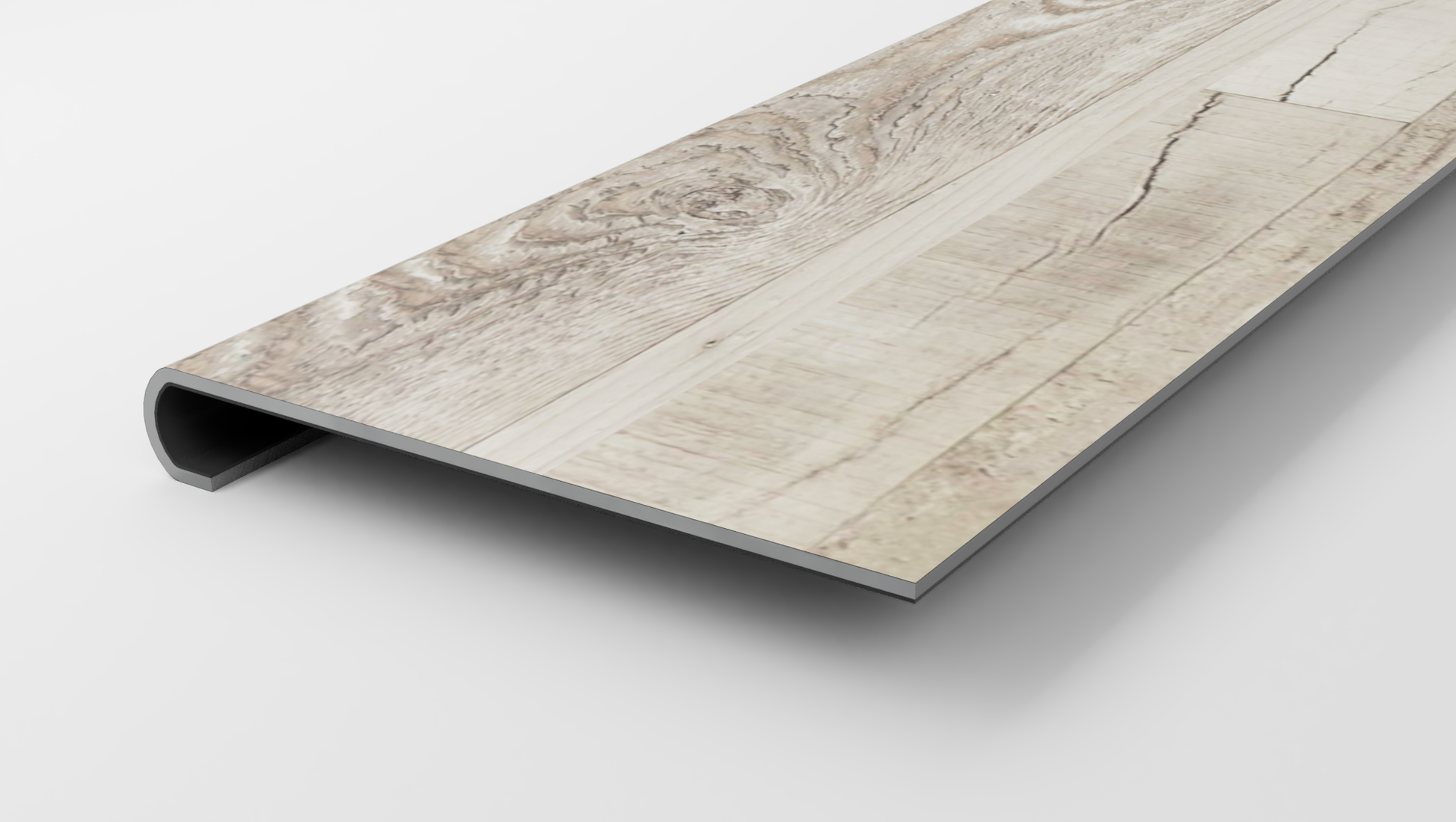 Made from NuCore Dockside Oak flooring, this Stair Nose will now allow you to use your favorite flooring on your stairs. Previously, you would have to use other tread brands that were made of subpar materials and only looked similar to your flooring! To make matters worse, a transition piece was often required at the top of the stairs posing both a hazard, and an eye sore. Treads Plus has made it possible to use true NuCore* Dockside Oak flooring to seamlessly transition from your flooring to your stairs.