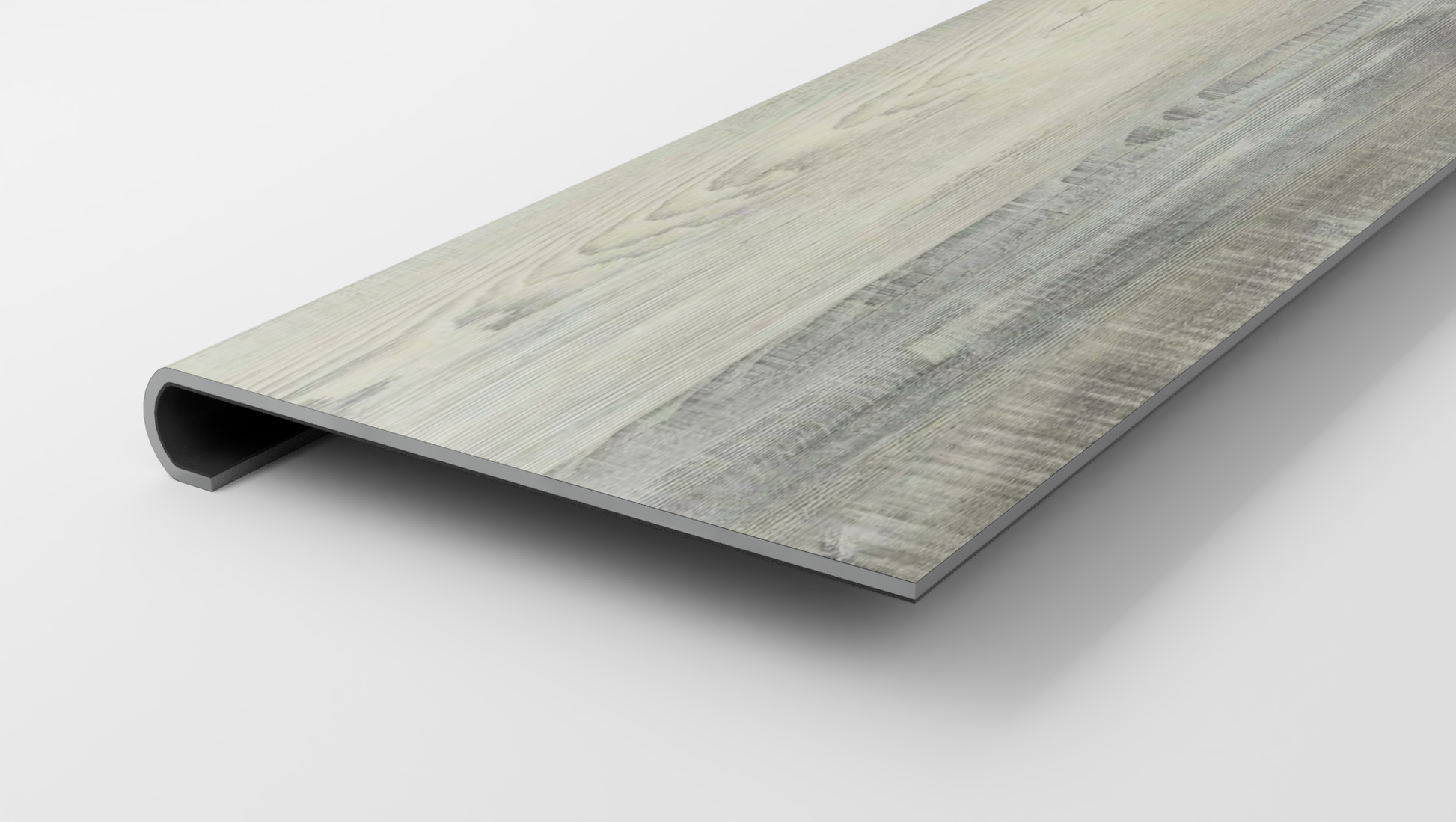 Made from Shaw Primavera HD Plus Whisper 20 MIL flooring, this Stair Nose will now allow you to use your favorite flooring on your stairs. Previously, you would have to use other tread brands that were made of subpar materials and only looked similar to your flooring! To make matters worse, a transition piece was often required at the top of the stairs posing both a hazard, and an eye sore. Treads Plus has made it possible to use true Shaw* Primavera HD Plus Whisper 20 MIL flooring to seamlessly transition from your flooring to your stairs.