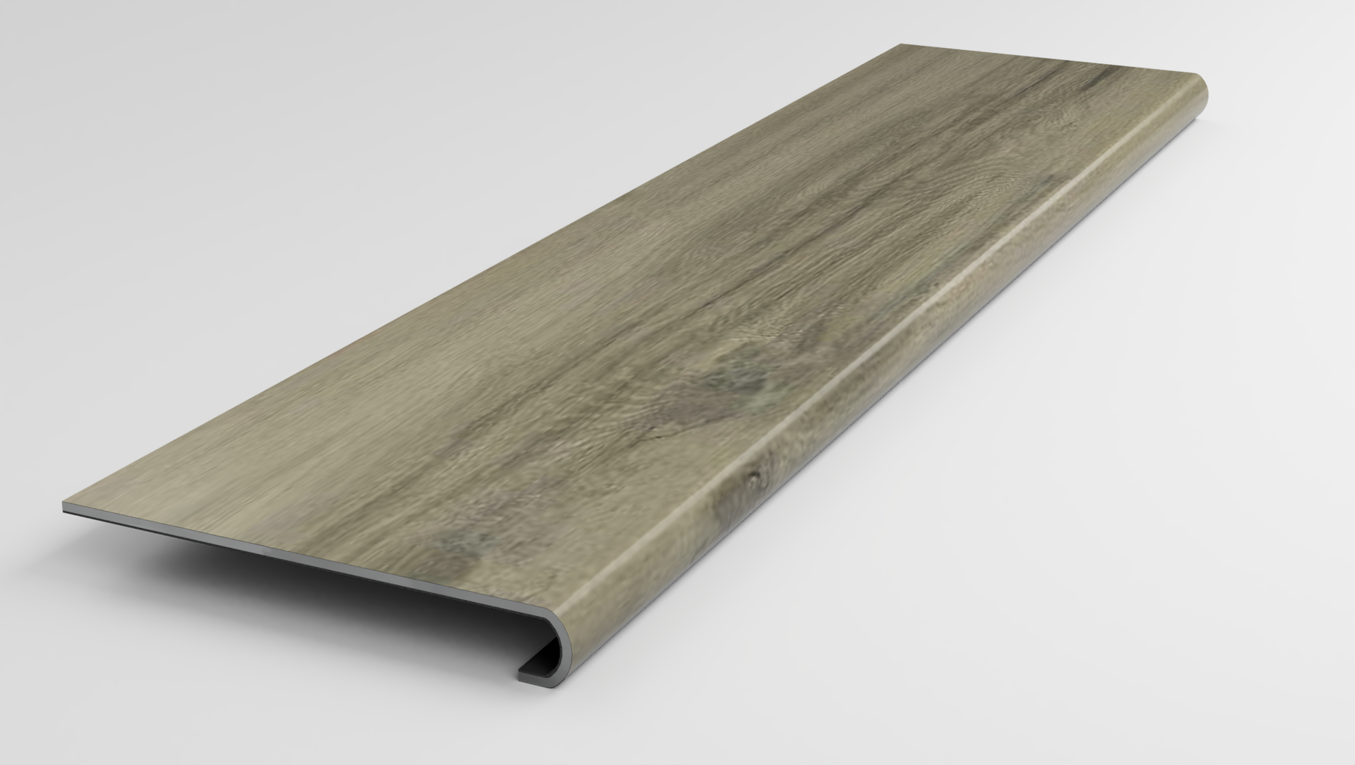 This variant is a Stair Nose made from a Lifeproof Sieni Ridge Oak Luxury Vinyl Plank. It is designed to be fitted and glued to the unfinished Stair Tread Nose. An addition Lifeproof Sieni Ridge Oak plank that you supply can be clicked in behind the nose to cover the remaining unfinished area.