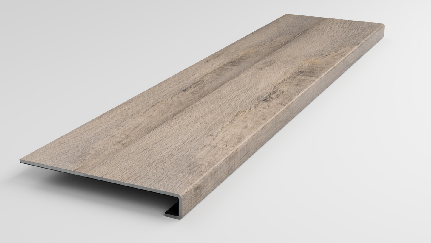 This variant is a Stair Nose made from a Style Selections* Webster Oak Luxury Vinyl Plank. It is designed to be fitted and glued to the unfinished Stair Tread Nose. An addition Style Selections* Webster Oak plank that you supply can be clicked in behind the nose to cover the remaining unfinished area.