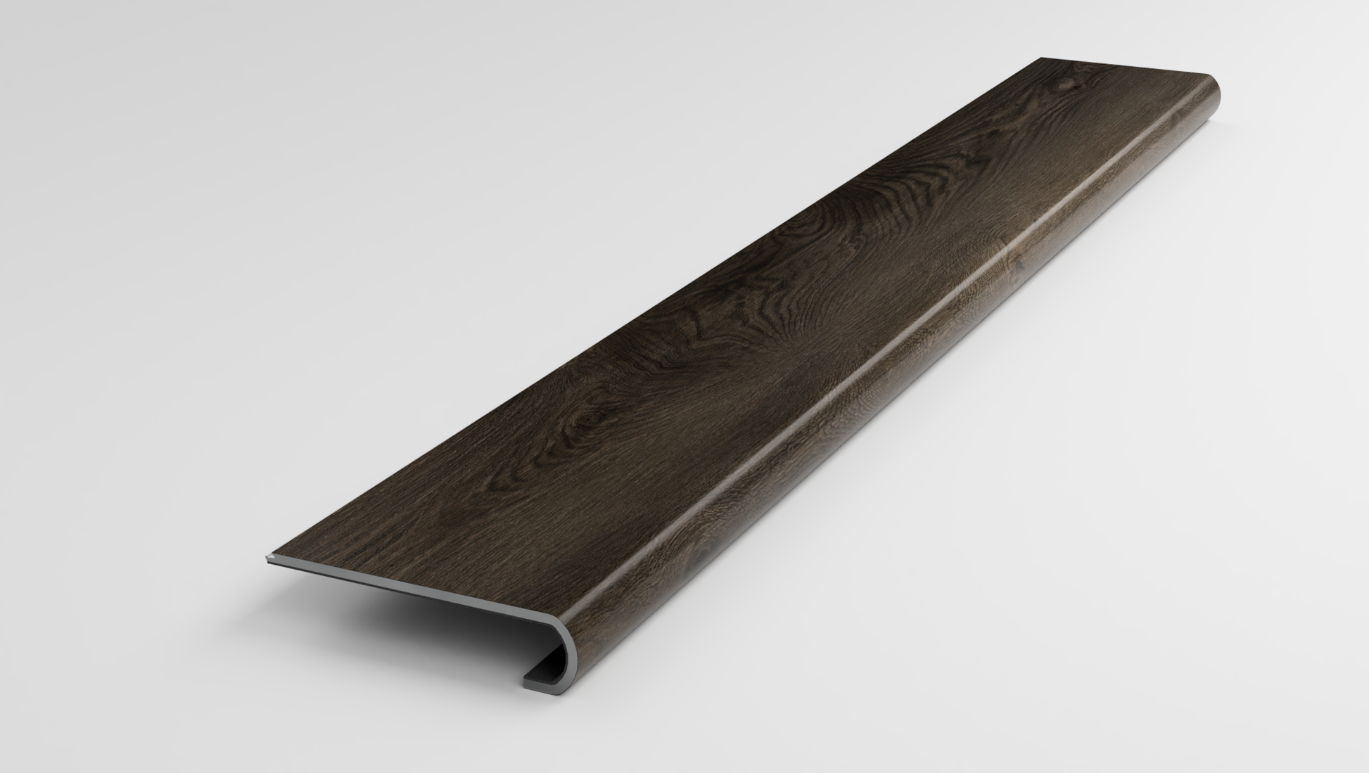 This variant is a Stair Nose made from a NuCore Woodland Pass Luxury Vinyl Plank. It is designed to be fitted and glued to the unfinished Stair Tread Nose. An addition NuCore Woodland Pass plank that you supply can be clicked in behind the nose to cover the remaining unfinished area.